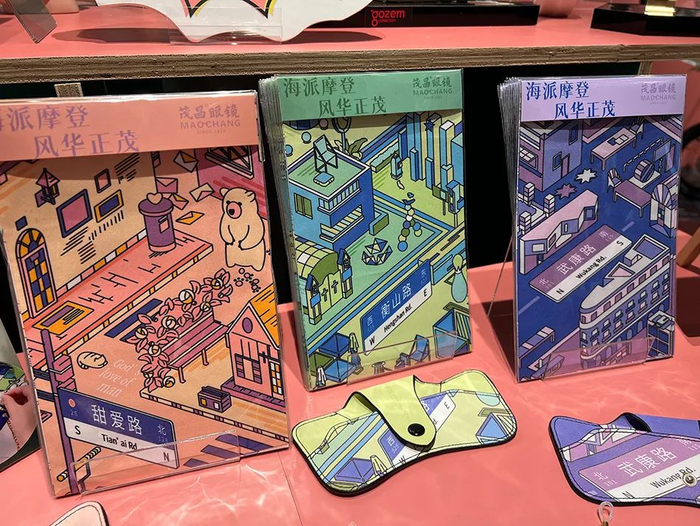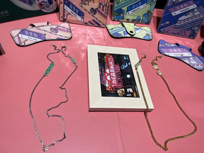 上海南京路步行街上,“茂昌眼镜公司”的红底白字霓虹招牌十分惹眼。上海馆内,这家知名老字号也带来了2022年的新品展示,它们分别是茂昌海派镜界系列擦拭布、茂昌100周年镜链和茂昌海派镜界系列镜袋。其中,擦拭布分别绘有武康路、甜爱路、衡山路三种主题图案。镜链则有“架粱”和“眯花眼笑”两款。