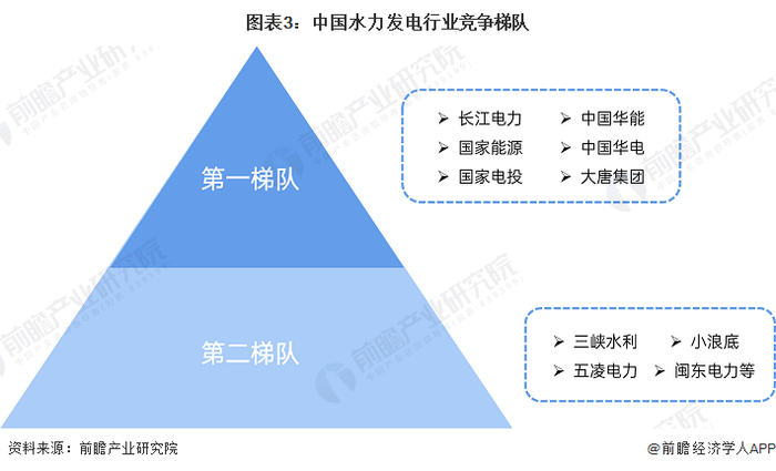 我国的水力发电行业以国有垄断为主,除了五大发电集团以外,我国水电业务也有众多优秀的发电企业。五大集团以外的企业以长江电力为代表,是单体水电装机容量最大的企业。按照水电装机容量份额,我国水力发电行业竞争梯队大致可以分为两个梯队,五大集团及长江电力居于第一梯队。