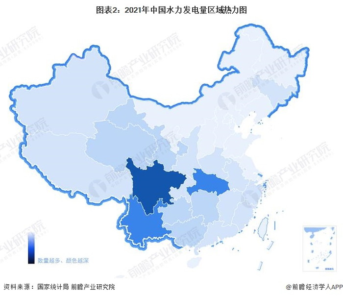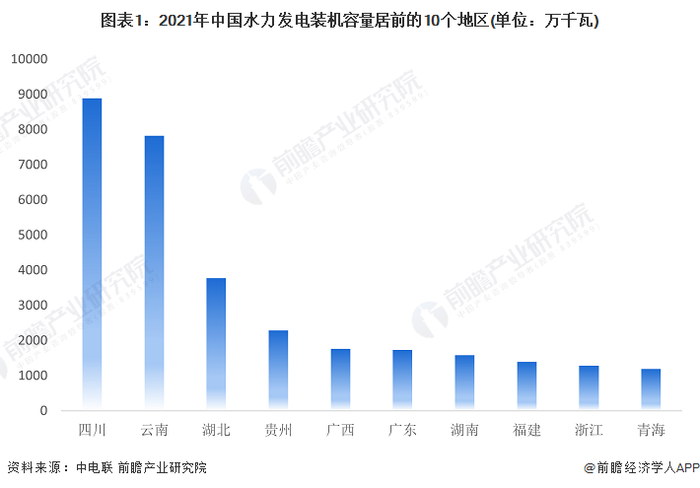 从装机容量分布来看,截至2021年末,我国水力发电规模最大的省份为四川省,水电装机容量达到了8887万千瓦,其次为云南,装机容量为7820万千瓦;排名二到十位的省份分别为湖北、贵州、广西、广东、湖南、福建、浙江和青海,装机容量在1000-4000万千瓦不等。