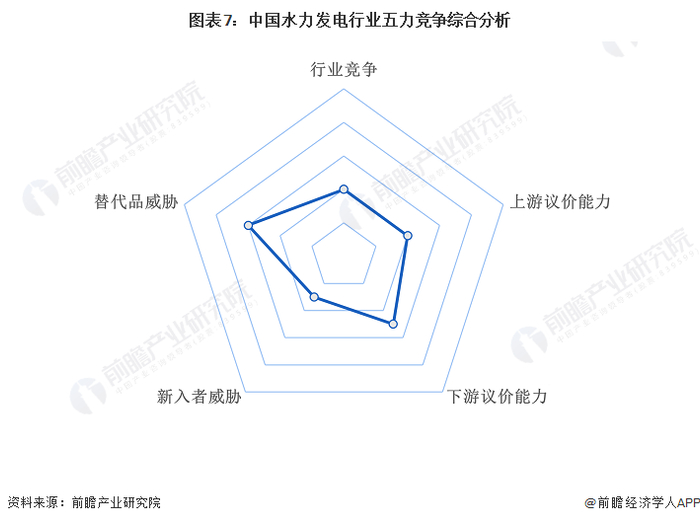 从五力竞争模型角度分析,电力是社会生产活动的必需品,水力发电作为一种可再生能源,与火电相比具有优先调度的优势,因此传统的火力发电对行业的威胁较小,但逐渐发展的新能源发电对水力发电行业的威胁有所增大,如近年发展较热的风力发电、光伏发电、生物质能发电等。从新进入者威胁情况来看,水电开发周期长、投资金额大,并且存在环境、跨省开发、跨区域售电、大量移民等问题,因此,由政府认定投资主体并逐一核准项目,特大型项目须上报中央部委核准,并在国务院办公会上会商,行业进入的高门槛使得新进入者的威胁较小。同时,水力发电行业以国有垄断为主、原材料和设备的供应充足、下游需求比较稳定,因此行业竞争、上游议价能力和下游议价能力均处于适中的水平。根据以上分析,对各方面的竞争情况进行量化,1代表最大,0代表最小,目前我国水力发电行业五力竞争总结如下: