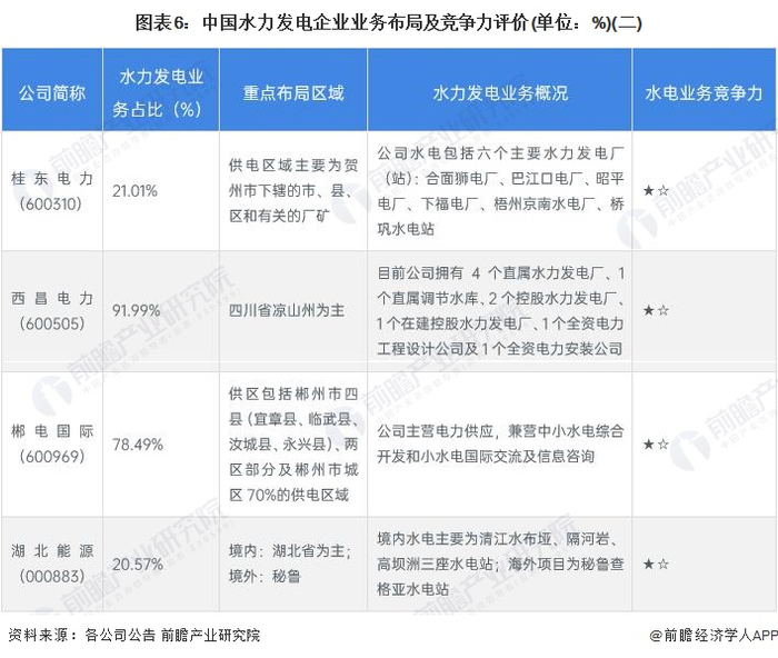 中国水力发电行业部分上市公司中,华能水电、西昌电力、长江电力主要专注于水力发电行业相关业务。从区域布局情况来看,上市企业以周边地区为主,湖北能源在秘鲁有所布局。