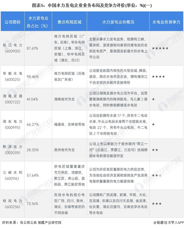 从企业水力发电业务的竞争力来看,长江电力、华能水电、桂冠电力的竞争力较强,主要表现在企业重点专注于水电业务,同时相关业务的业绩情况也处于行业领先地位。