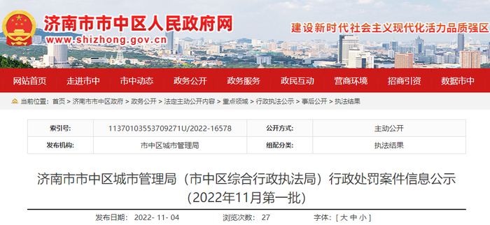 中国质量新闻网讯(李静)近日,济南市市中区城市管理局(市中区综合行政执法局)公示了2022年11月第一批行政处罚案件信息。