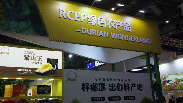 第一财经记者在进博会现场看到,在进博会食品及农产品展区内,今年还特设了RCEP绿色农产业展区。还没走到展区,马来西亚榴莲、柬埔寨香米的味道就扑鼻而来。