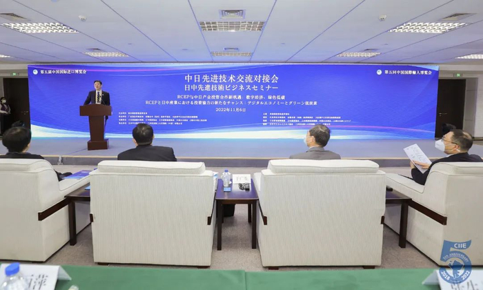 2022年11月6日,由商务部投资促进事务局主办的第五届中国国际进口博览会配套活动“中日先进技术交流对接会”在国家会展中心(上海)举行。活动以“RCEP与中日产业投资合作新机遇:数字经济、绿色低碳”为主题,由广东茂名市商务局、安徽长丰(双凤)经济开发区、大虹桥中日企业交流发展联盟共同承办,得到日本贸易振兴机构、日中经济协会、日中投资促进机构、中国日本商会、上海日本商工俱乐部、日本中日数字总商会、三井住友海上火灾保险(中国)有限公司的支持。世界500强和知名跨国公司高管、日本驻华使领馆代表、日本商协会负责人、中国地方政府、园区和企业代表等100余人出席活动。活动由人民中国杂志社副总编辑、日本企业(中国)研究院执行院长陈言主持。