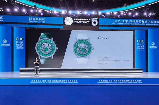 相比往届,今年各大品牌上新的数量及含金量普遍上升。第三次参展的历峰集团带来卡地亚、梵克雅宝、寇依等10个奢侈品牌,发布多款品牌新作,比如卡地亚中国首发限定款白金碧玉猎豹装饰昼夜显示腕表,将经典猎豹形象放置在国人钟爱的碧玉上。同一展区,曾将巨型羽绒服和针织裙带至现场的优衣库,本届又搭起2.5米高的“XXXL号”保暖内衣,并首发与Marni联名系列在内的16款新品。