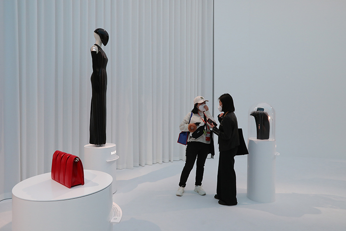纵观消费品展区,可持续继续唱主角,各大品牌接力创新,共同促进时尚和生活方式产业的绿色发展。从展场布置来看,可持续理念和企业社会责任相关产品占据显眼位置。快时尚巨头H&M展示了两项纺织业环保最新解决方案,分别是经济环保地利用可吸附二氧化碳的大型藻类,去除牛仔布厂废水中靛蓝染料的生物降解技术;以及能减少纺织废料与对原生纤维消耗的利用摩擦生电系统的蛋白质纤维无水分离法。首次单独参展的飒拉现场则没有任何展品,只有多个高清壁式led屏幕组成的巨型魔方,不间断播放最新系列,仿若一场艺术展。
