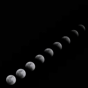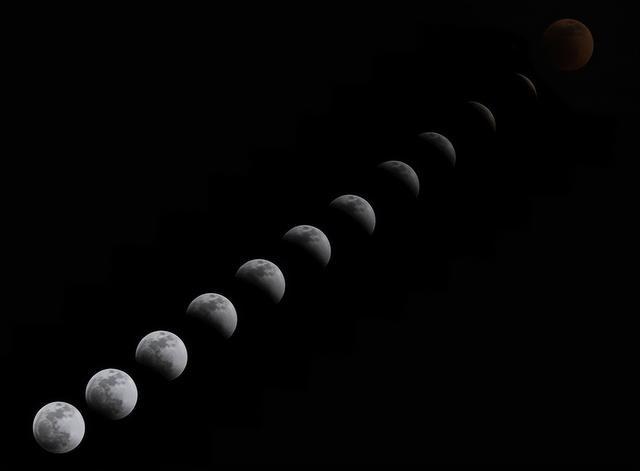 一般来说,一次月全食发生分8个阶段,半影食始、初亏、食既、食甚、最大食分、生光、复圆及半影食终。