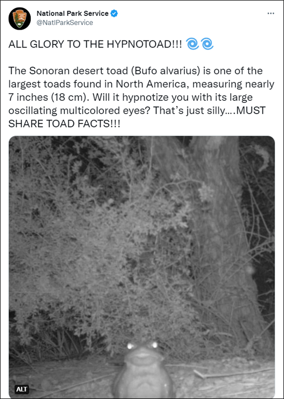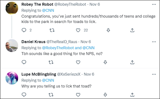 在遇到多起相关病例和案情后,自11月2日开始,美国国家公园管理局(NPS)发出多条警告,说明“蟾蜍舔”也可能导致焦虑、恶心或癫痫发作,在某些情况下甚至会导致死亡。