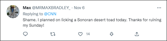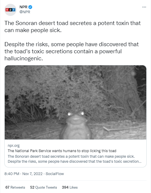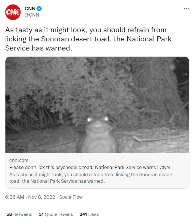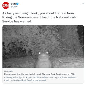 如上图所示,CNN在官方推特账号上警告民众:尽管这种蟾蜍看着“很美味”,但请千万不要去舔它。此外,美国《纽约时报》、国家公共广播公司也发布了同样的消息,警告大家“千万别用舌头舔这种蟾蜍”。