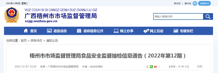 广西梧州市市场监管局发布2022年第12期食品安全监督抽检信息