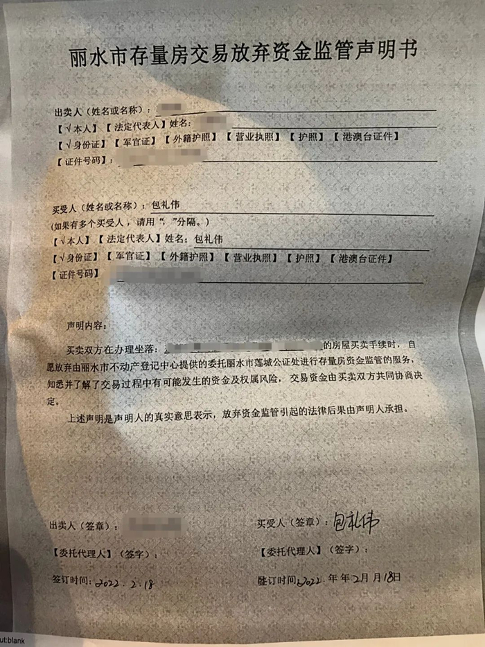 但这并不是一项强制规定,在丽水关于资金监管的《告知书》中提到,包括直系亲属、房屋共有人、非自然人之间转让不动产,交换或赠与形式转让不动产等,以及其他不具备条件的,可以暂不纳入存量房交易资金监管,但双方要签订放弃资金托管声明书。对于张霞和包礼伟这种先过户,再通过抵押贷款结算尾款的交易方式,记者从丽水不动产登记中心的工作人员处得知,这种情况同样无法纳入资金监管。