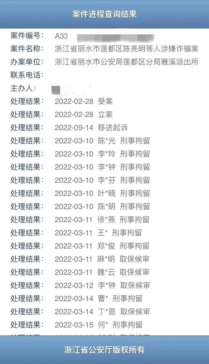 据了解,针对张霞等业主遭遇的骗局,丽水当地公安部门以诈骗罪立案调查,目前案件已经进入移送起诉阶段,有多名嫌疑人被刑事拘留或取保候审。
