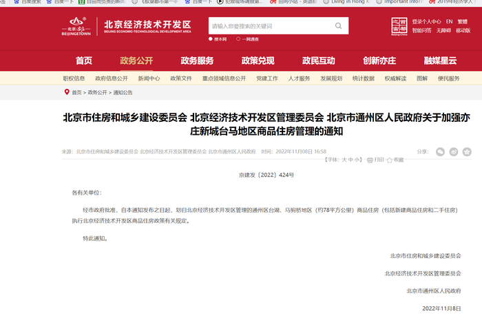 北京市住房和城乡建设委员会、北京经济技术开发区管理委员会和北京市通州区人民政府8日联合下发《关于加强亦庄新城台马地区商品住房管理的通知》,其中明确,经市政府批准,自本通知发布之日起,划归北京经济技术开发区管理的通州区台湖、马驹桥地区(约78平方公里)商品住房(包括新建商品住房和二手住房)执行北京经济技术开发区商品住房政策有关规定。