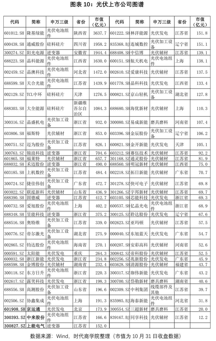 光伏行业市值分化相对较小,且产业链多个环节的龙头企业皆跻身市值前十。其中,在中下游硅片及组件环节领先的隆基绿能(601012.SH),以及在上游硅料环节领先通威股份(600438.SH)市值排名前二;生产光伏配件逆电器的阳光电源(300274.SZ)、生产光伏加工设备的晶盛机电(300316.SZ)、迈为股份(300751.SZ)也皆有上榜。