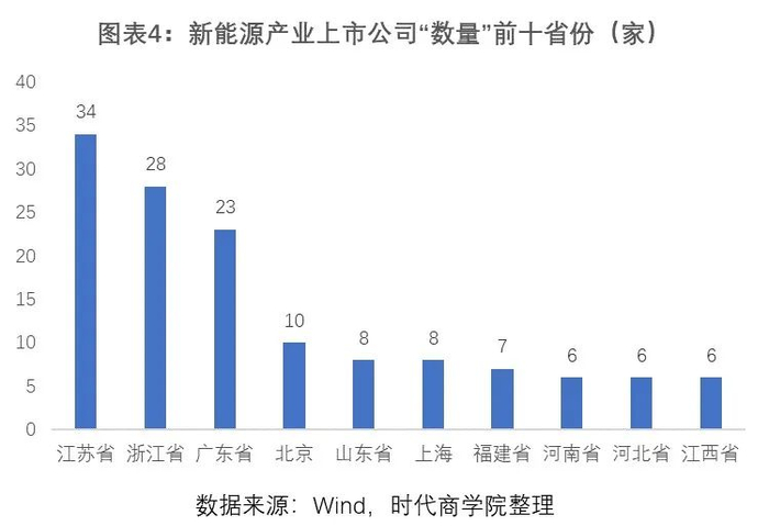 按省份来看,新能源产业上市公司中,江苏上市公司数量最多,达34家;浙江、广东紧随其后,分别为28家、23家,此三个省份构成第一梯队。