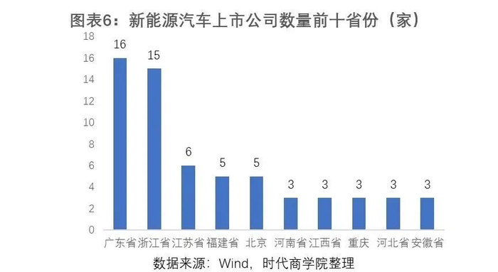 分行业来看,各省份在新能源产业发展中侧重不同行业。广东在新能源汽车行业领先优势较大,共有16家新能源汽车A股上市公司,总市值达1.41万亿元。