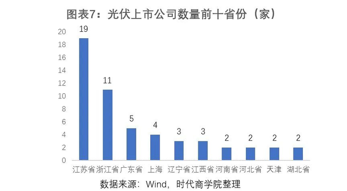 江苏在光伏行业具有一定领先优势,其A股上市公司数量排名第一,达19家;总市值排名第二,达4744.59亿元。