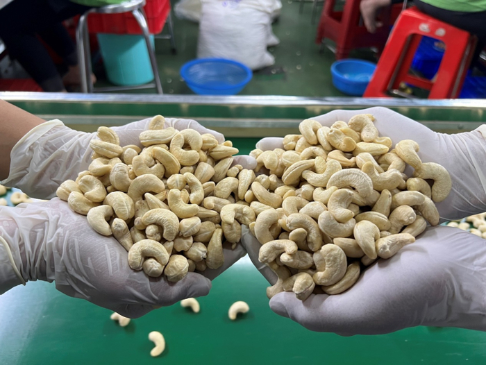 每年3月下旬到5月,在柬埔寨、越南等全球腰果主要产区迎来收获季。等腰果连壳“坠地”后,工人们将地上的果子采收起来、晾晒3-7天,随后运到位于越南平福省腰果原料工厂,经过开壳、清洗、等级筛选等环节,一箱箱的生货原料被送往胡志明市,登上货船。