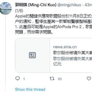 此后,苹果“预言帝” 、天风国际的资深科技业分析师郭明錤发推称,据他的最新调查,歌尔股份暂时停产的产品可能是高端无线耳机AirPods Pro 2,停产比较可能源于生产问题,而非需求问题。