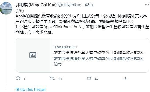 郭明錤:歌尔股份可能停产的是AirPods Pro 2 并非需求问题 而是生产原因