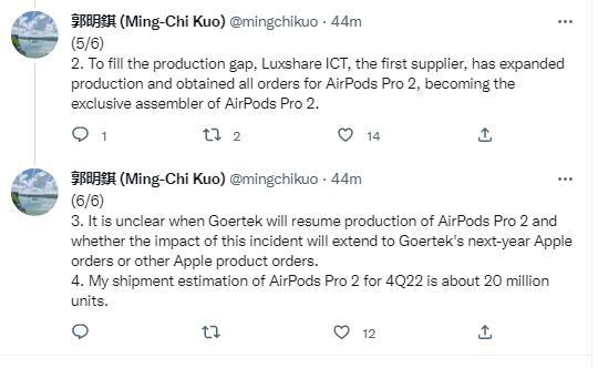 郭明錤还表示,目前不清楚歌尔股份将何时恢复生产AirPods Pro 2,也不清楚这次事件对该司明年的苹果订单和其他苹果产品的订单有怎样的影响。