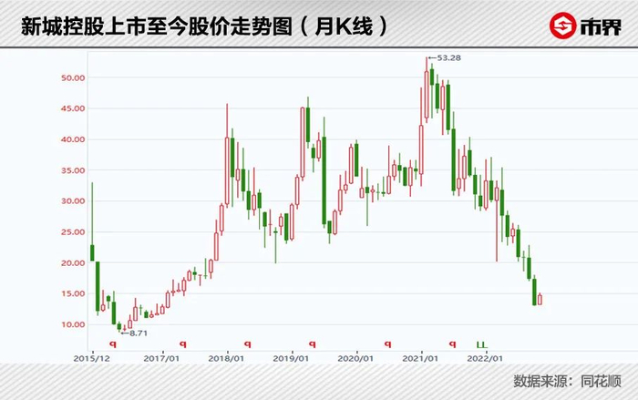 这一年,新城控股还有好消息:营收同比增长15.6%,股价一度涨到历史最高点。不过,与其它房企一样,新城控股也是“增收不增利”。在喜忧参半中度过的新城控股,不仅没能重回前十,行业排名更下滑至第16名。这使得新城控股股价走势后继乏力。