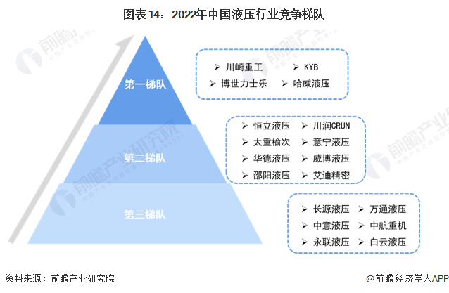 中国液压行业企业大致分为三个梯队。第一梯队的企业是以博世力士乐、KYB等为代表的国外液压行业领先企业;第二梯队是知名度高、产品销量好的企业,包括恒立液压、邵阳液压、太重榆次、川润等,这些企业销售多种液压产品;第三梯队有万通液压、中航重机等,这些液压品牌所属的企业均属于上市企业。