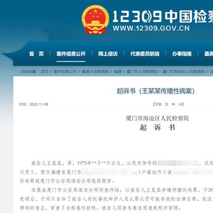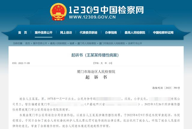 11月9日,厦门市海沧区人民检察院公布了一则起诉书,被告人王某某在明知自己患有严重性病的情况下,仍然两次实施嫖娼行为,检方以传播性病罪提起公诉。