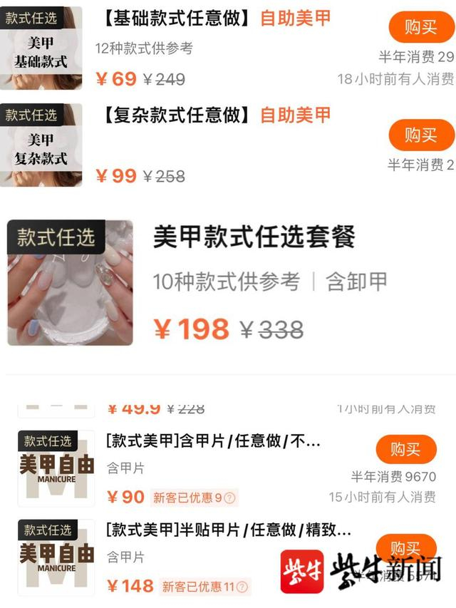 为了提高市场竞争力,不少美甲店还推出了“自助美甲”。所谓的“自助美甲”则是在固定价格内,不限颜色、不限款式地供顾客挑选美甲。记者在线上团购平台看到,自助美甲低至49元,高至189元。
