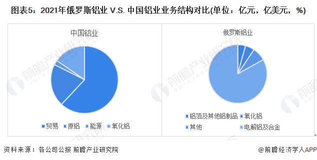 中国铝业相较于俄罗斯铝业,其业务多元化程度较高,中国铝业还涉及炭素产品的生产、销售、技术研发,国际贸易,物流产业,火力及新能源业务。