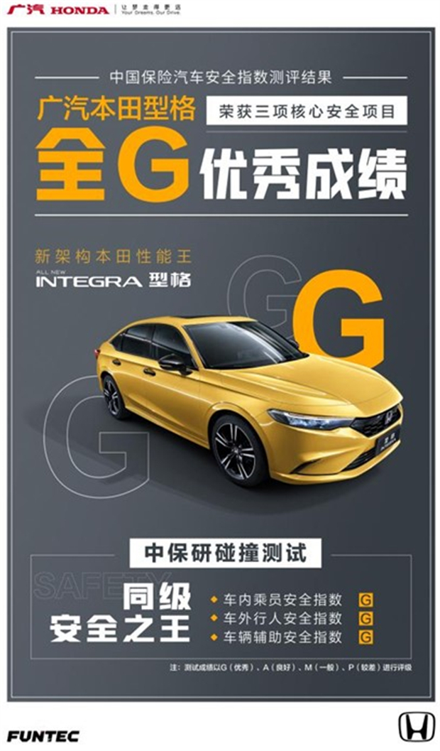 型格(INTEGRA)基于Honda Architecture新架构打造,以全方位领先同级的安全基准,刷新了公众对于A+级轿车安全性能的认知。作为道路交通主要参与者,广汽本田秉持“为了所有人的安全”的理念,不断提升旗下产品的安全性能,为构筑“零事故”社会而努力,让每一位用户都能畅享自由移动的喜悦。