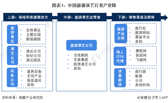从产业结构来说,中国旅游演艺行业产业链包括三部分:产业链上游主体为各类资源供应商,包括旅游景区管理提供的场地,演艺公司提供的舞台设备、节目编排团队、演职人员;产业链中游为旅游演艺运营商,负责旅游演艺项目的运营和营销环节;产业链下游为各分销商和代理商,以及最终消费群体。