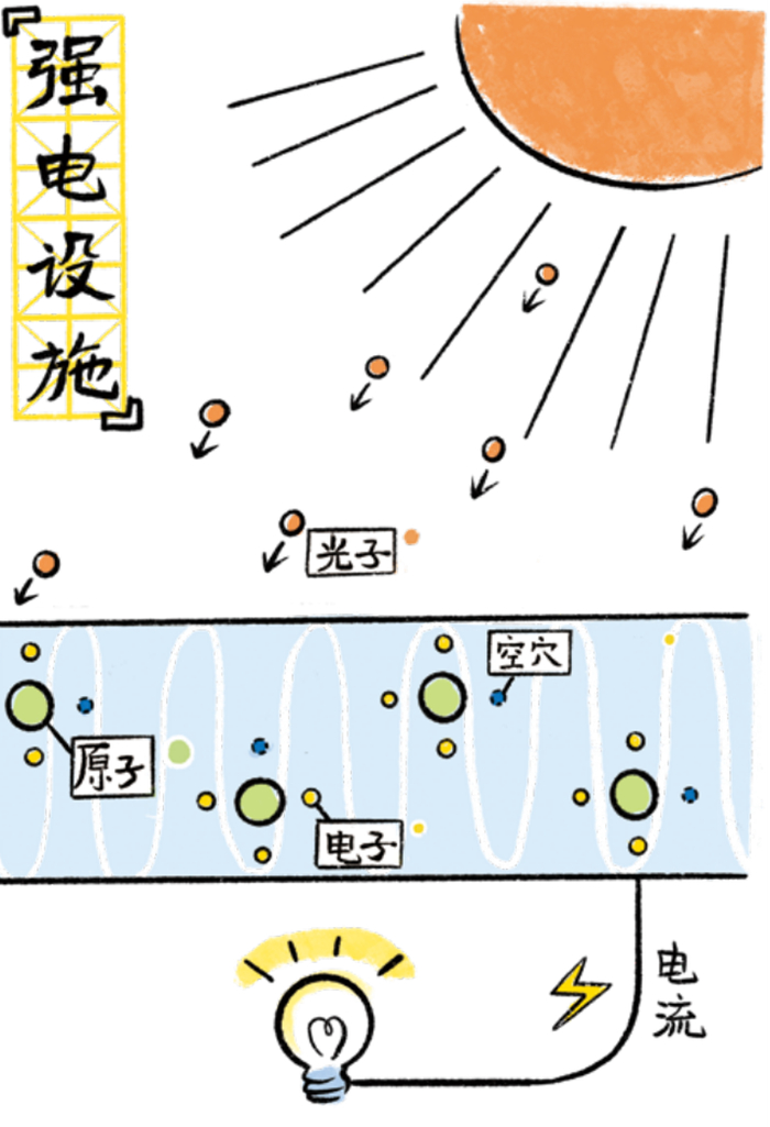 空间站的“强电设施”主要包括太阳翼、电路和配电单元三部分。通过太阳翼上面粘贴的太阳能电池片将太阳能转化为电能,在配电单元的统一调配下,电能通过电路源源不断地输送给空间站的各个设备。