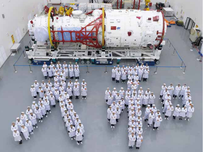 参与“天和”核心舱的部分研制人员与航天器合影,杨卓/摄。