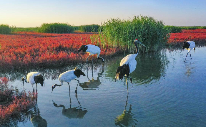 通过实施一系列湿地保护和修复工程,景区内生物多样性得到明显改善,环境空气质量得到进一步提升。通过采取改善生态环境、人工科学投放食物和营造鸟类适宜生存条件等举措,景区内野生动物数量明显增加,仅候鸟种类就多达300余种。许多丹顶鹤不再把这里当成南北迁徙的短暂停息地,而是当成了永久家园“定居”下来,广大游客也从中享受到了红海滩的生态红利。