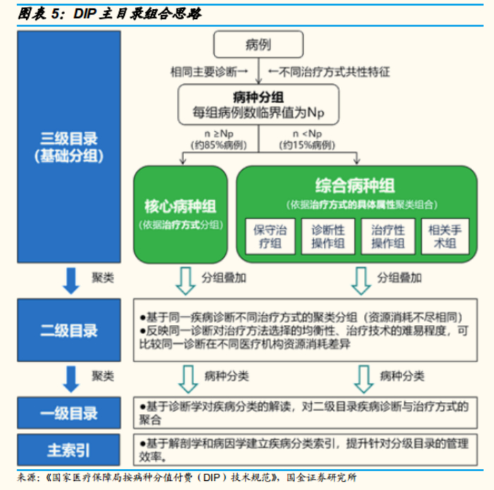 DIP(Diagnosis Intervention Packet,按病种分值付费),DIP采用工分制原理,将不同病种医疗费用与权重之间的相对比价关系,换算出每个病种的分值,依据年终基金支出预算确定分值单价支付。
