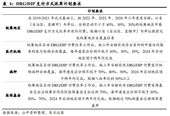国家医保局于2021年11月26日发布了《DRG/DIP支付方式改革三年行动计划》,开始进行按疾病诊断相关分组(DRG)/病种分值(DIP)支付方式改革三年行动计划。到2024年底,预计全国所有统筹地区全部开展DRG/DIP支付方式改革工作,到2025年底,DRG/DIP支付方式覆盖所有符合条件的开展住院服务的医疗机构。