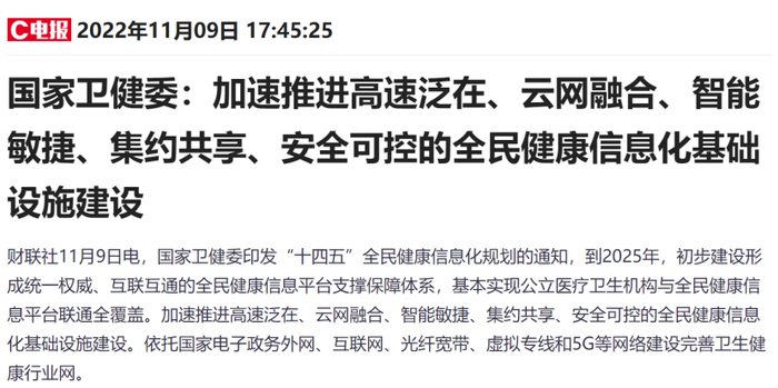 消息面上,国家卫健委昨日晚间发布《“十四五”全民健康信息化规划》提出,到2025年,初步建设形成统一权威、互联互通的全民健康信息平台支撑保障体系,基本实现公立医疗卫生机构与全民健康信息平台联通全覆盖。