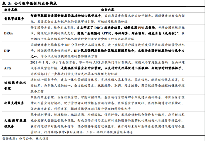 具体来看,王凤华研报中表示,国新健康是国内唯一可以提供专业化DRG、DIP、APG的综合服务的公司,服务范围覆盖了住院和门诊按病种(病组)支付,并实现基金支付全过程大数据动态监管。DRG业务方面,公司已服务50多个地区,市场占有率保持领先;DIP业务方面,公司已服务30余个地区,市占率快速拓展。