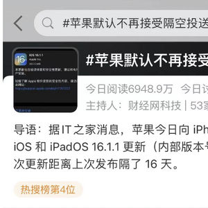 11月10日,苹果iOS16.1.1正式版发布,距离上次发布更新间隔了16天。这次版本最大的调整是默认不再接受隔空投送。这一消息在早间登上微博热搜榜第4位,引发网友广泛关注。