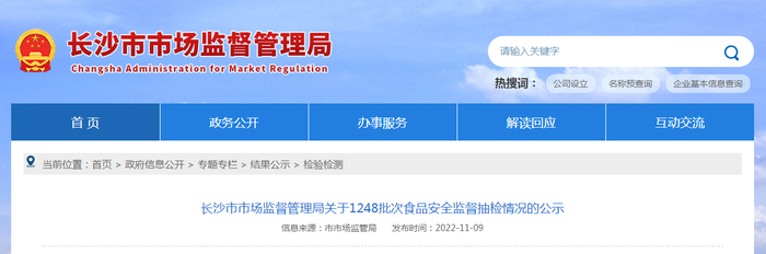 长沙市市场监督管理局公示1248批次食品安全监督抽检情况
