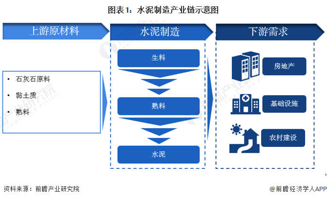 水泥制造业上游原材料主要为石灰石原料、黏土质和熟料;下游需求主要为房地产、基础设施和农村建设。水泥制造环节主要是通过原材料加工为生料到熟料再到水泥的过程。