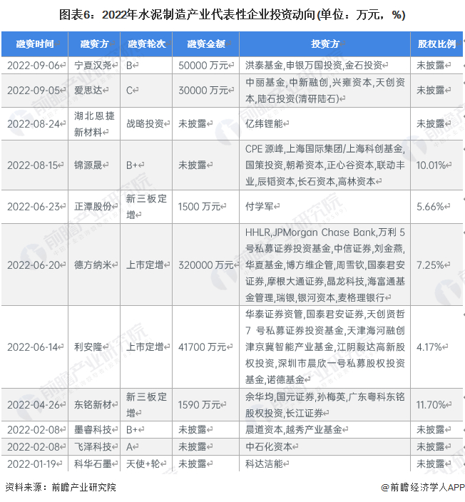 2022年以来,水泥制造产业代表性企业的投资动向主要包括收购公司拓展业务、通过对子公司增资的方式投资水泥制造生产基地项目。水泥制造产业代表性企业最新投资动向如下: