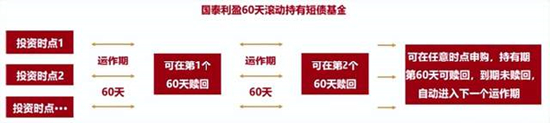 国泰利盈每笔份额设置60天滚动运作期,基金成立开放日常申赎后,每个交易日可申购,每笔份额需要滚动持有60天,当期运作期到期日可赎回,赎回费为0。如当期运作期到期日未提出赎回申请,则自该运作期到期日次一日起该基金份额进入下一个运作期。