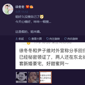 徐冬冬把这则爆料截图晒出来直接否认:“姐好久没搜自己了,今天心情好,咔咔一顿搜...这是假的,姐未婚。”