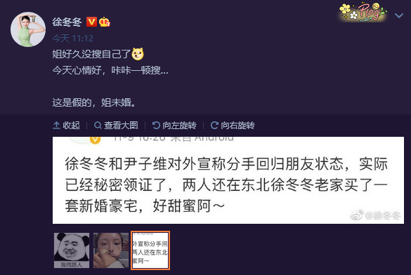 11月11日,演员徐冬冬否认与尹子维隐婚:这是假的,姐未婚。