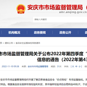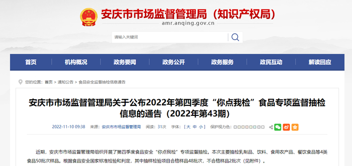 中国质量新闻网讯 2022年11月10日,安徽省安庆市市场监督管理局网站公布2022年第四季度“你点我检”食品专项监督抽检信息(2022年第43期)。信息显示,近期,安庆市市场监督管理局抽检乳制品、饮料、食用农产品、餐饮食品等4类食品50批次样品。其中,抽检饮料10批次,根据食品安全国家标准检验和判定,全部合格。