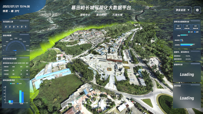 图为慕田峪长城可视化数据分析平台,将票务、客流量、环境监测、车流状态等数据进行整合及可视化呈现,对慕田峪整体运行状态进行实时监测