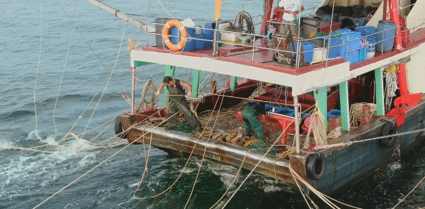 澳门先民,以海为生,出海打鱼坐的渔船叫“虾艇”。这种渔船展开两侧悬臂时,足有50米宽,它可以同时拖拽20张渔网,专门用来捕捞游弋海底的虾蟹。